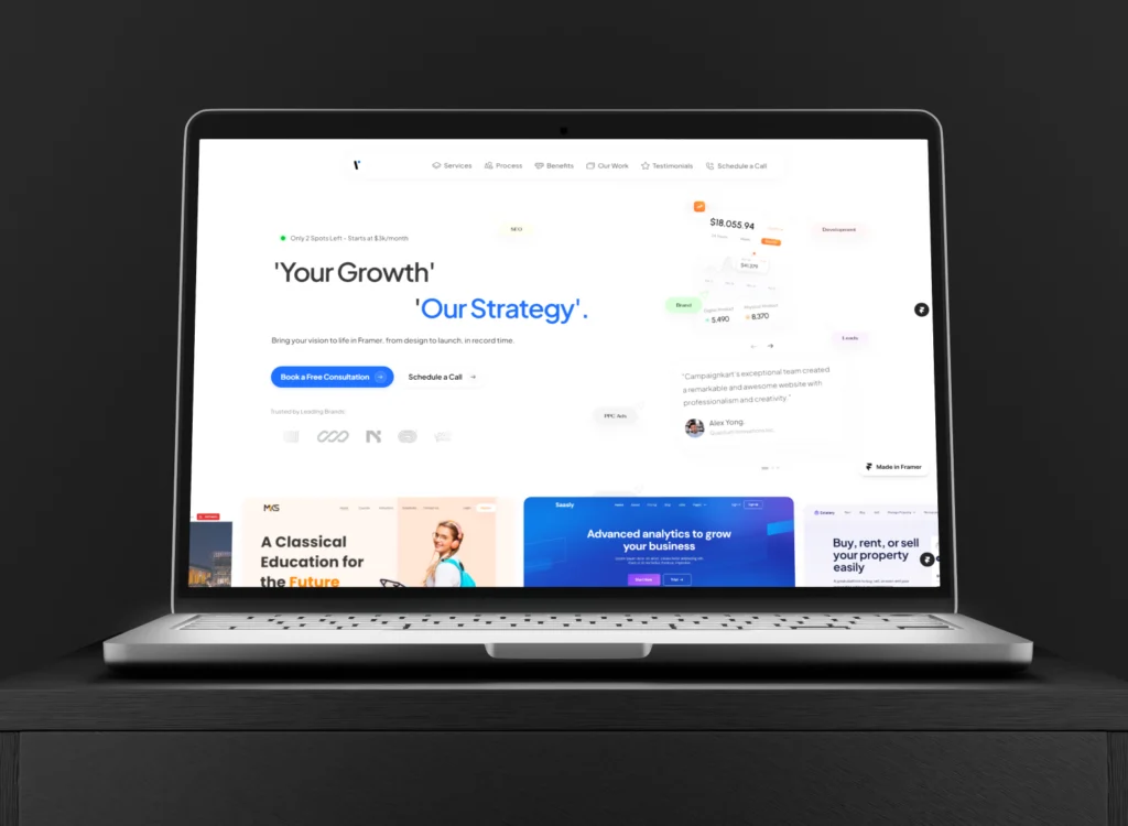 Using Framer, I developed a sleek, one-page website with a conversion-focused layout and modern design aesthetics. Key solutions included: